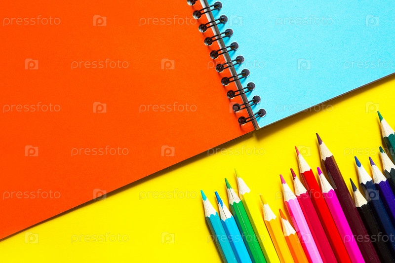 Радужная палитра цветных карандашей со спиральной тетрадью на желтом фоне, макет, плоская планировка. Снова в школу, набор учеников, художник, уроки рисования. Скопируйте пространство. Канцтовары для творчества