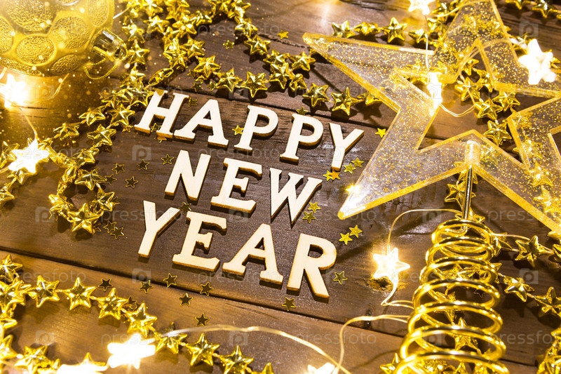 С Новым годом - деревянные буквы на праздничном фоне с блестками, звездами, огнями гирлянд. Привет, открытка
