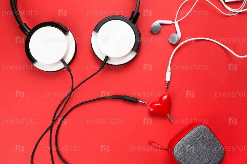 Разветвитель для наушников в форме сердца для влюбленной пары. Подключил к красной переносной колонке и две пары наушников - плоские лежали. День святого Валентина, любовь, современные технологии, пространство для копирования