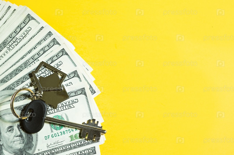Ключ от дома с брелком на стопке 100-долларовых купюр на желтом фоне. Покупка квартиры, дома, недвижимости, бизнеса, ипотека и жилищный кредит в банке, сбережения, наличные, переезд. Копировать пространство