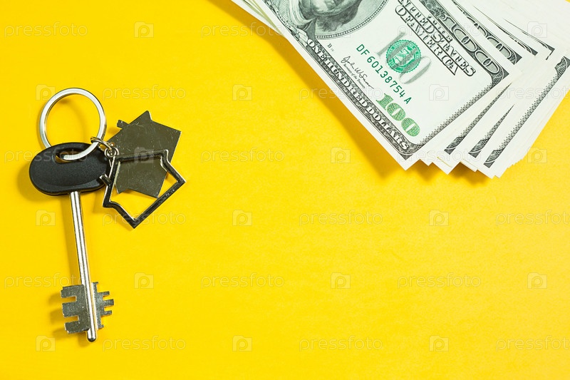 Ключ от дома с брелком на стопке 100-долларовых купюр на желтом фоне. Покупка квартиры, дома, недвижимости, бизнеса, ипотека и жилищный кредит в банке, сбережения, наличные, переезд. Копировать пространство
