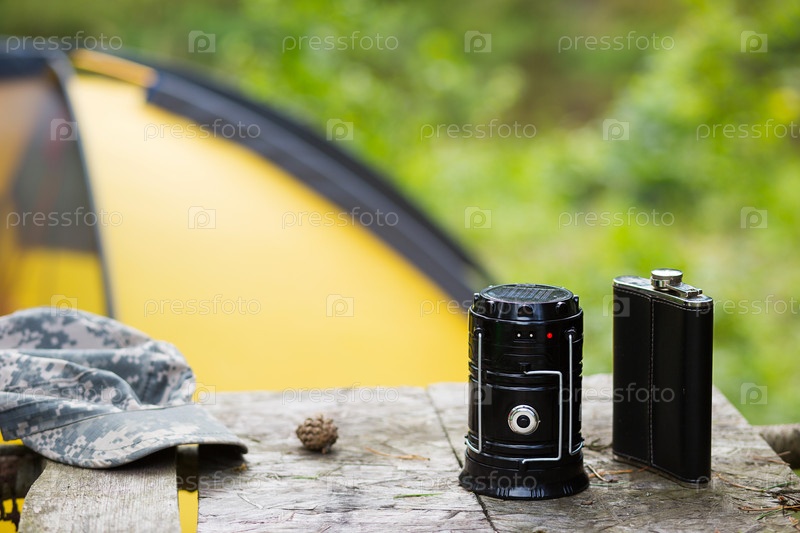 Кемпинг переносной фонарь на дорожном столбе с палаткой на заднем плане. Концепция походов на природу, активного отдыха, снаряжения