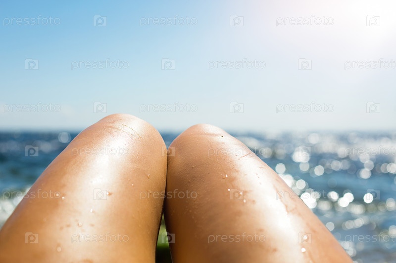 Гладкие загорелые женские ножки в брызгах воды на пляже на фоне моря. Средства для загара, защита от загара, уход за кожей, депиляция, пляжный отдых. Копировать пространство