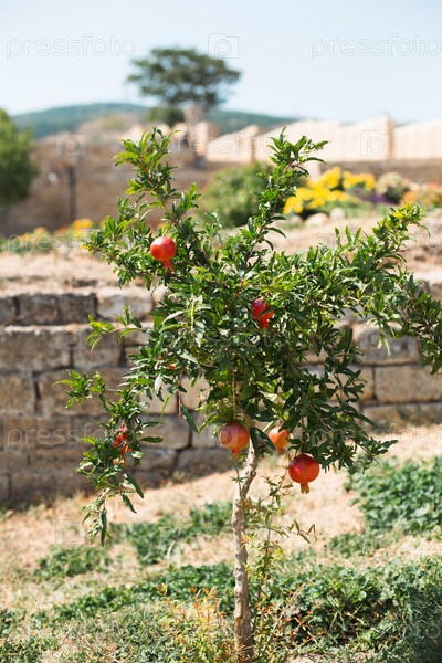Спелый красный гранат висит на ветке фруктового дерева. Натуральная еда, экологически чистый, фруктовый сад