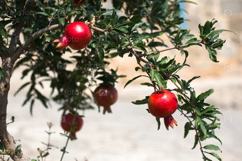 Спелый красный гранат висит на ветке фруктового дерева. Натуральная еда, экологически чистый, фруктовый сад