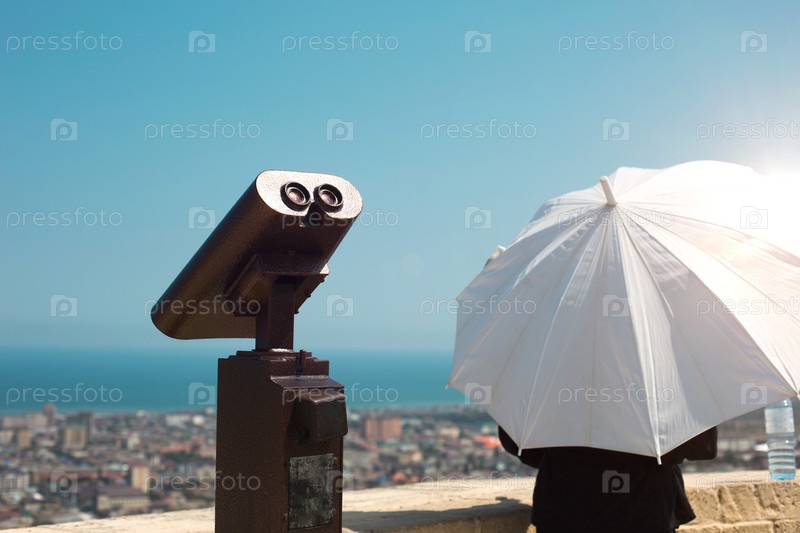 Бинокль с высоты на смотровой площадке с видом на панораму города и моря. Тур по достопримечательностям