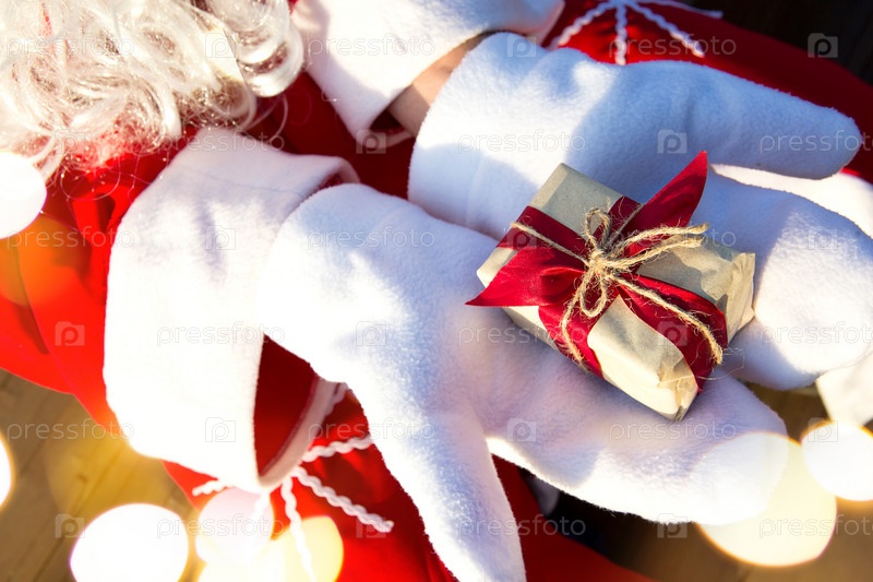Коробка с рождественским подарком в руках Деда Мороза в белых варежках. Красный костюм, борода, гирлянды в размытом свете. Новый год, подготовка, ожидание чуда, сбывшаяся мечта. Крупным планом