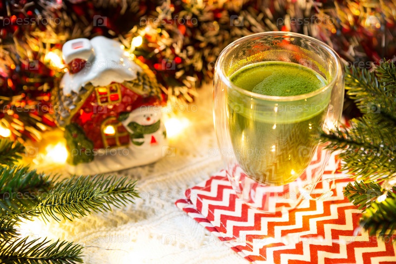Прозрачный стеклянный стакан с двойными стенками и японским чаем маття на столе с рождественским декором. Новогодняя атмосфера, гирлянда и мишура, еловая ветка, уют, вязаный плед, шар, полосатая салфетка