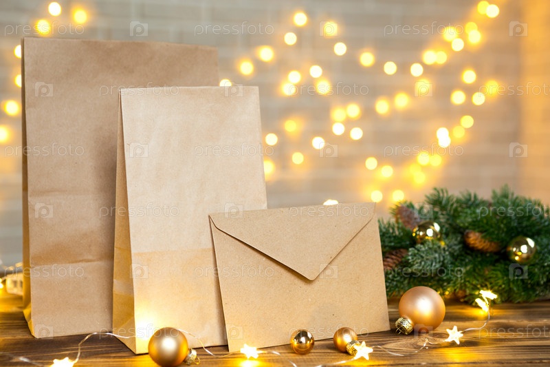 Рождественский декор службы доставки еды одноразовый пакет из крафт-бумаги. Готовый заказ, экологически чистая перерабатываемая упаковка, ноль отходов. Праздничное питание, приготовление сладостей домашнего приготовления. макет, тег