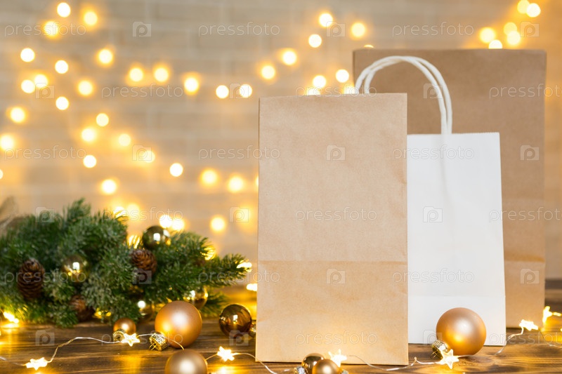 Рождественский декор службы доставки еды одноразовый пакет из крафт-бумаги. Готовый заказ, экологически чистая перерабатываемая упаковка, ноль отходов. Праздничное питание, приготовление сладостей домашнего приготовления. макет, тег