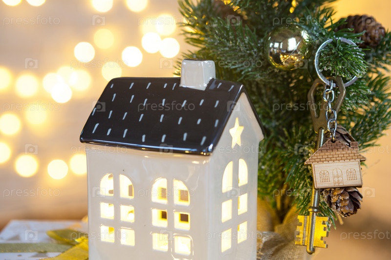 Ключ от дома с брелоком на столе с рождественским декором. Подарок на Новый год, Рождество. Строительство, дизайн, проект, переезд в новый дом, ипотека, аренда и покупка недвижимости. Копировать пространство