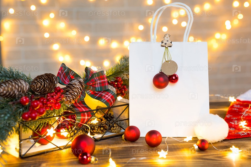 Бумажный подарочный пакет на Рождество и Новый год в праздничном декоре и гирляндах. Бирки с макетом, натуральный декор, ручная работа, доставка. Скопируйте пространство. фон