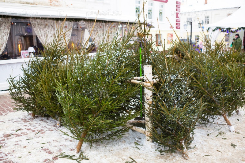 Рождественский базар с живыми елками на улице города. Новогоднее настроение, снег, продаются срезанные ели и хвоя, аромат смолы и хвои. Рождество, Новый год