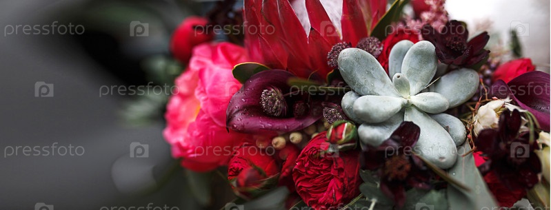 Ярко-красный осенний дизайнерский букет пионов, роз, суккулентов, лилий Калла крупным планом. Букет невесты, свадебный аксессуар. Цветочный фон для праздника, дня рождения, юбилея. Место для текста, баннер