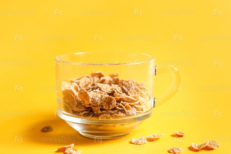 Прозрачная миска с кукурузными и многозерновыми хлопьями на желтом фоне. Быстрый и полезный завтрак