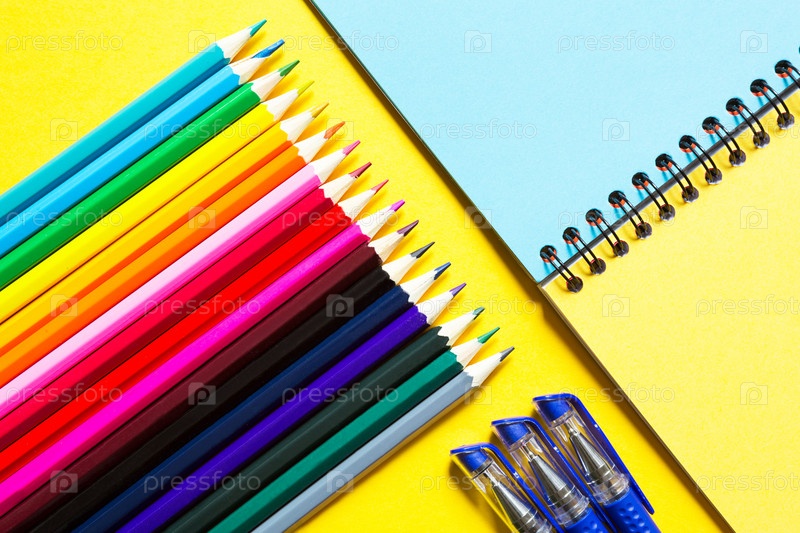 Радужная палитра цветных карандашей со спиральной тетрадью на желтом фоне, макет, плоская планировка. Снова в школу, набор учеников, художник, уроки рисования. Скопируйте пространство. Канцтовары для творчества