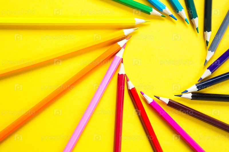 Набор цветных карандашей на желтом фоне выложен по кругу в форме солнца. Копирайт, рамка. Снова в школу, художник, уроки рисования. Канцтовары для творчества, рисования