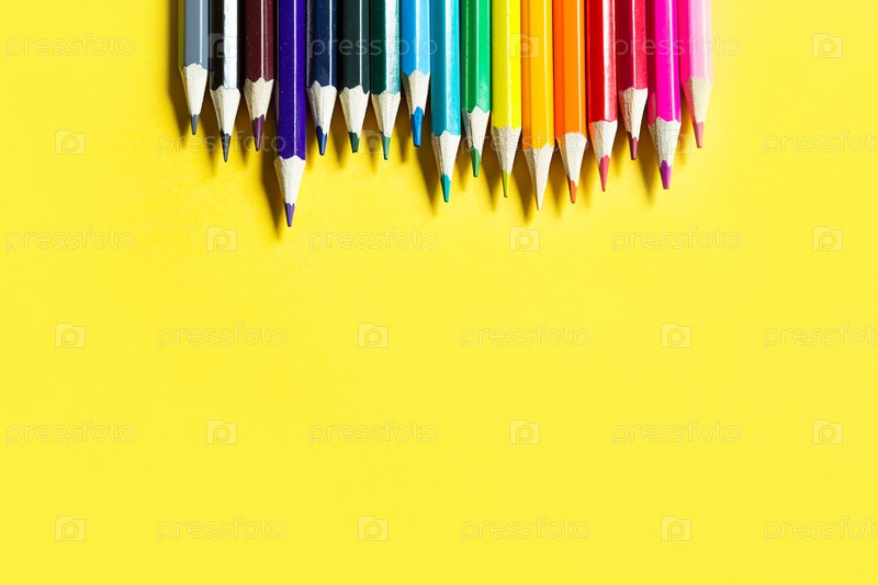 Набор красочных карандашей на желтом фоне. Копипространство, рамка. Снова в школу, художник, уроки рисования. Канцтовары для творчества, рисования