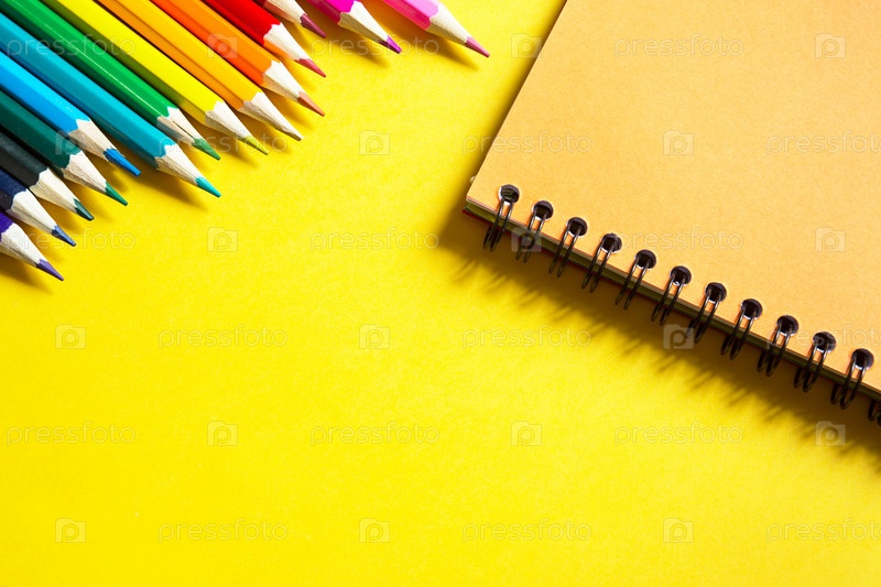 Радужная палитра цветных карандашей со спиральной тетрадью на желтом фоне, макет, плоская планировка. Снова в школу, набор учеников, художник, уроки рисования. Скопируйте пространство. Канцтовары для творчества