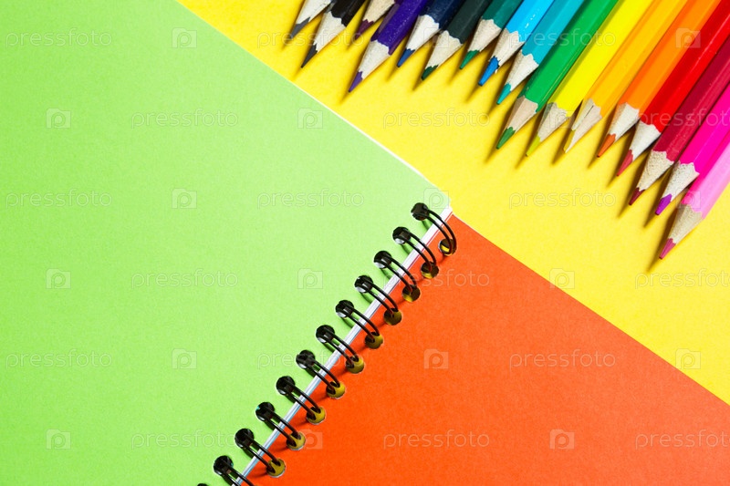 Радужная палитра цветных карандашей со спиральной тетрадью на желтом фоне, макет, плоская планировка. Снова в школу, набор учеников, художник, уроки рисования. Канцтовары для творчества