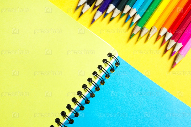 Радужная палитра цветных карандашей со спиральной тетрадью на желтом фоне, макет, плоская планировка. Снова в школу, набор учеников, художник, уроки рисования. Канцтовары для творчества
