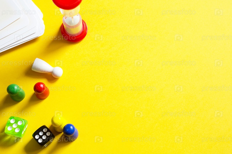 Макет настольных игр на желтом фоне: кости, фишки, таймер песочных часов. Развлечение дома для детей и взрослых. Копировать пространство