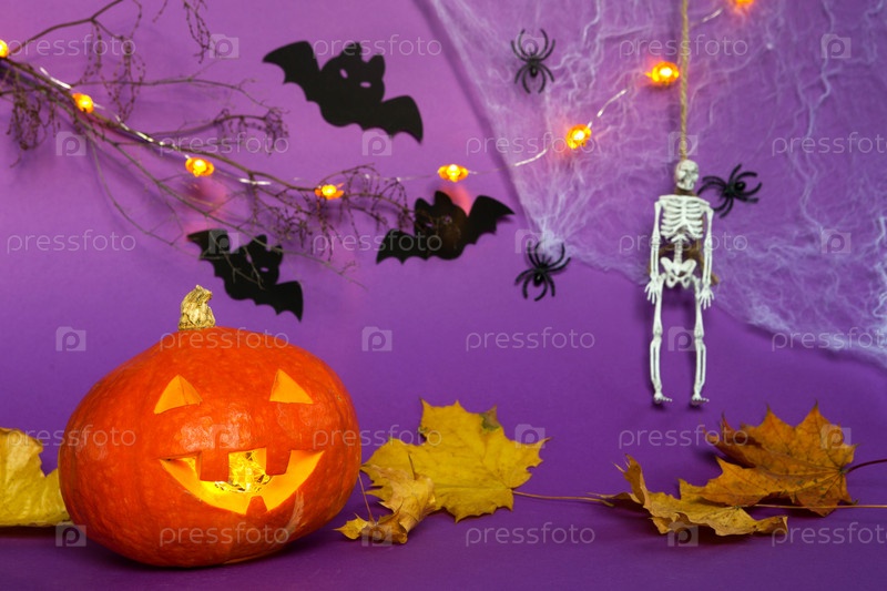 Хэллоуин фон из тыквы фонаря Джека, паутины, скелета на веревке, пауков и черных летучих мышей на фиолетовом фоне с ужасными пейзажами. Ужас и страшный праздник с копией пространства
