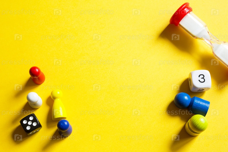 Макет настольных игр на желтом фоне: кости, фишки, таймер песочных часов. Развлечение дома для детей и взрослых