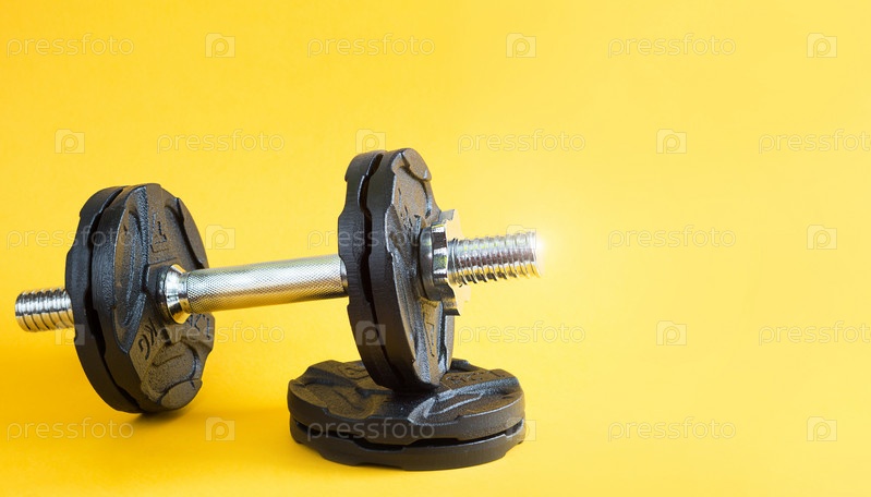 Гантель с дисками на желтом фоне крупным планом. Спортивный образ жизни, силовые тренировки, тренажерный зал