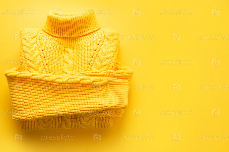 Желтый вязаный свитер свернут на желтом фоне, copyspace. теплая сезонная одежда весной и осенью, поднимающая настроение