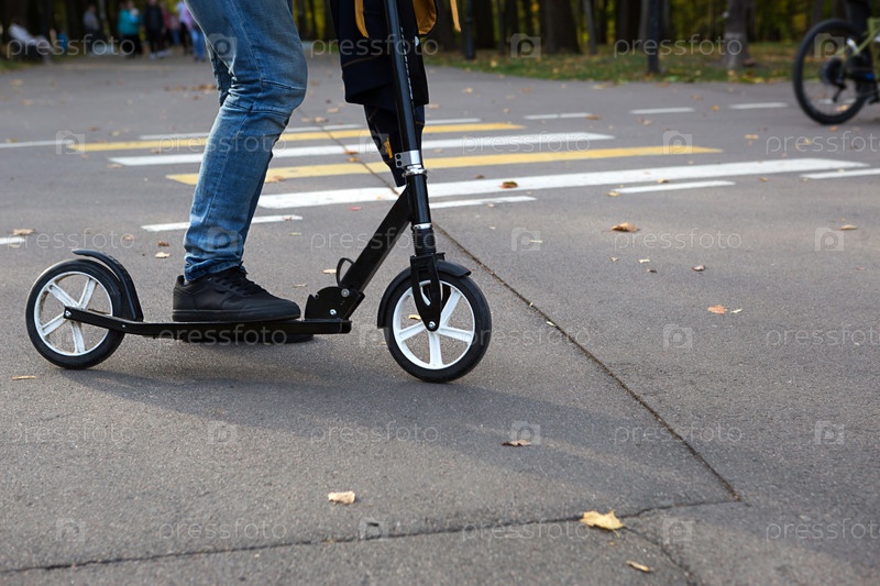 Ноги мужчины в джинсах и кроссовках на скутере в парке осенью с опавшими сухими желтыми листьями на асфальте. Осенние прогулки, активный образ жизни, экологически чистый транспорт, пробки