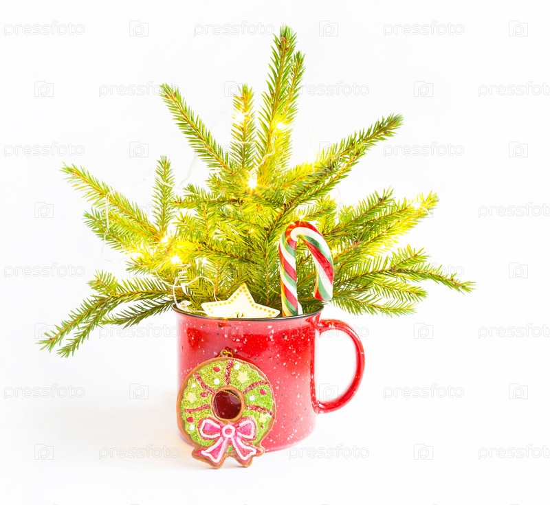 Новогодний букет в красной кружке из живой ели и праздничные украшения и аксессуары, игрушки для елки, сладости. Новый год, праздничное настроение, флористика на белом фоне