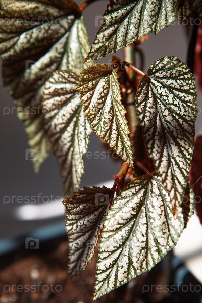 Коралловый бегония Corallina, крупный план argentea-guttata с серебристыми пятнами при ярком солнечном свете со тени. комнатные растения в горшках, домашний декор, уход и выращивание