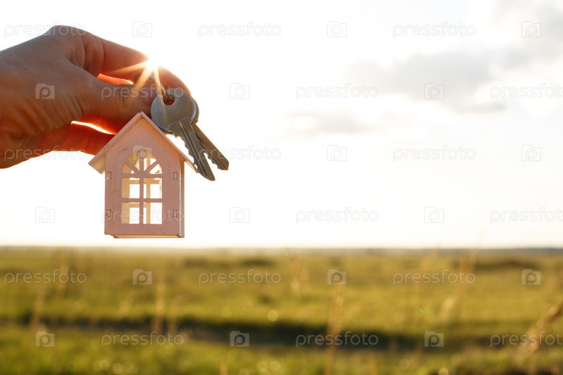 Белая деревянная фигура дома и ключи в руке на фоне неба и поля. Мечта о своем доме, строительство коттеджа в деревне, план и дизайн, сдача проекта, переезд в новый дом