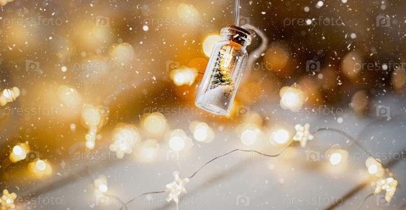Сказочные огни в банке с рождественской елкой и снегом крупным планом в теплом уютном настроении с золотой гирляндой. Рождество и Новый год, праздничный декор, пространство для копирования. Рождественский фон