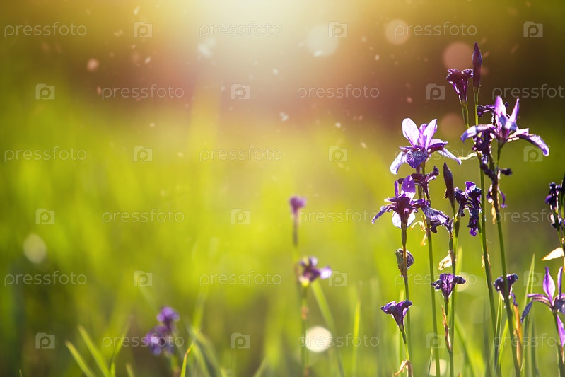 Поле диких фиолетовых цветов в траве на солнце. Весна, лето, ирисы