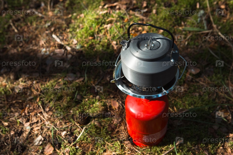 Готовим, топим туристический чайник на переносной газовой горелке красным газовым баллоном. Летние мероприятия на свежем воздухе