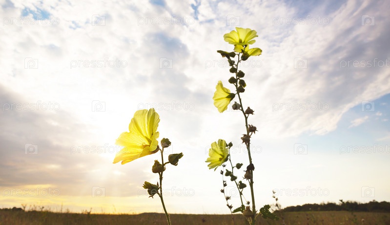 Желтый цветок на фоне красивого неба с облаками. Дикий однолетний гибискус, колокольчик, дурман, садовые растения, пространство для копирования. Закат в поле