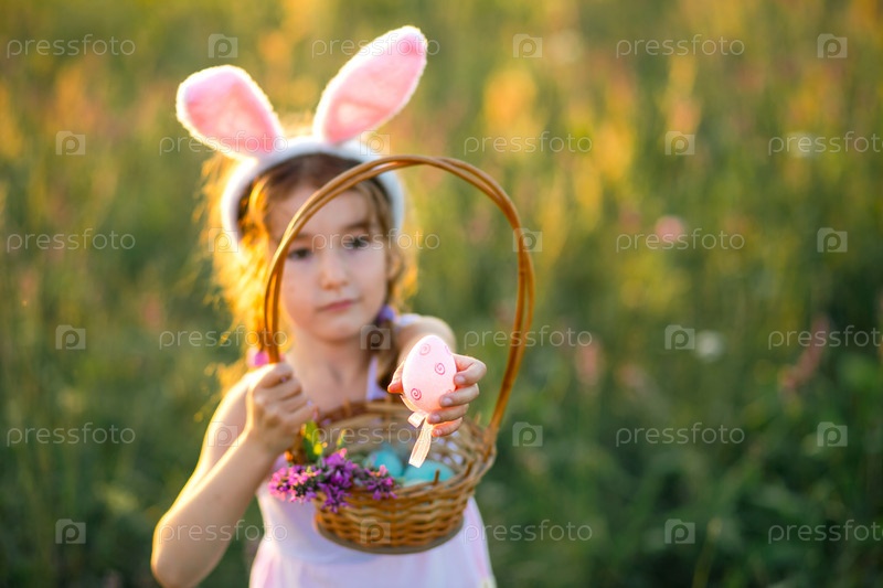 Милая забавная девушка с крашеными пасхальными яйцами весной на природе в поле с золотым солнечным светом и цветами. Праздник Пасхи, пасхальный кролик с ушами, разноцветные яйца в корзине. образ жизни