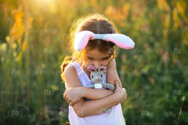 Милая 5-летняя девочка с кроличьими ушками нежно обнимает игрушечного кролика на природе в цветущем поле летом с золотым солнечным светом. Пасха, пасхальный кролик, детство, счастливый ребенок, весна