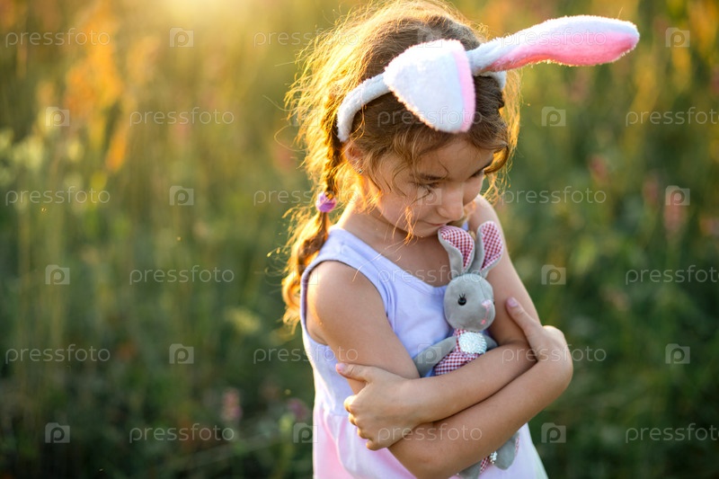 Милая 5-летняя девочка с кроличьими ушками нежно обнимает игрушечного кролика на природе в цветущем поле летом с золотым солнечным светом. Пасха, пасхальный кролик, детство, счастливый ребенок, весна