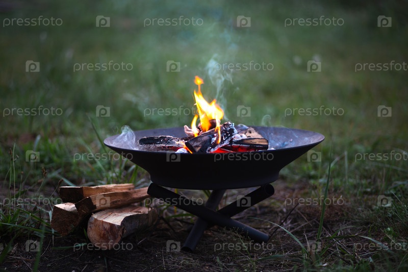 Пламя костра горит в металлической чаше для костра - согрейте руки у костра, размешайте дрова палкой. Очаг с дровами для безопасного костра на открытом воздухе. Тепло, уют для посиделок