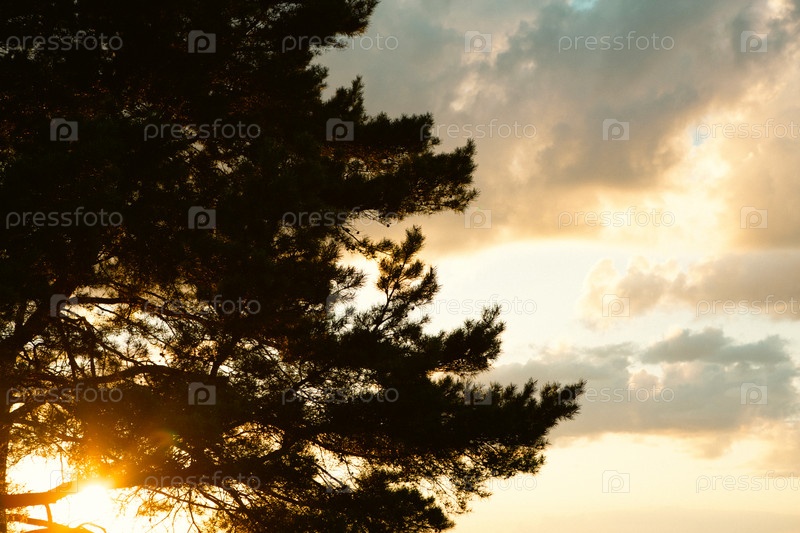 Силуэт ветвей большой сосны на фоне оранжевого неба вечером. Облака на закате летом освещены оранжевым светом солнца. Небесный волшебный свет