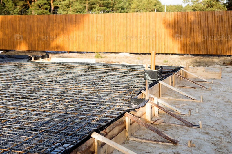 Железная арматура на деревянной опалубке с уложенными трубами является основой для заливки фундамента дома бетонной плитой. Строительство коттеджей, проектирование, инженерные коммуникации