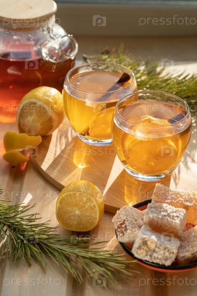 Композиция со стеклянным чайником и стаканами, наполненными чаем с лимоном