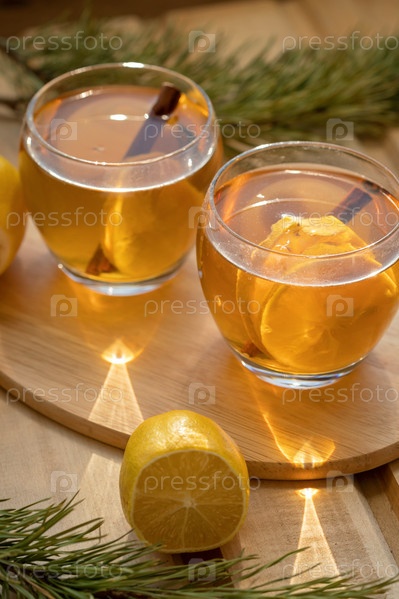 Композиция со стеклянными стаканами, наполненными чаем с лимоном