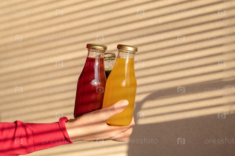 Женская рука держит стеклянные бутылки с разноцветными соками