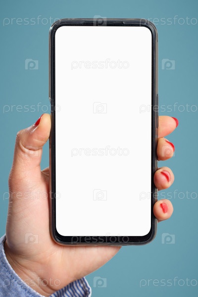 Женская рука вертикально держит смартфон с пустым белым экраном на синем фоне