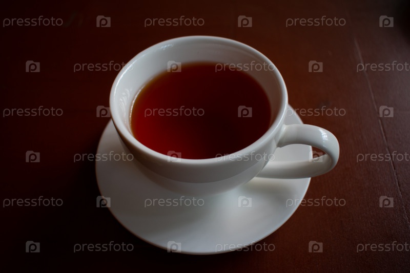 Белая чашка на блюдце с красным черным чаем или напитком на фоне размытого деревянного стола крупным планом. Рестораны и заведения. Чайная церемония