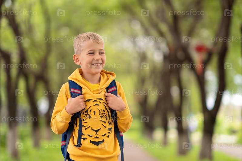 Белокурый мальчик в желтой толстовке и с рюкзаком на плечах идет в школу
